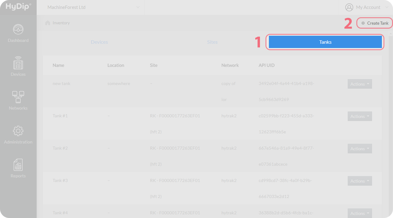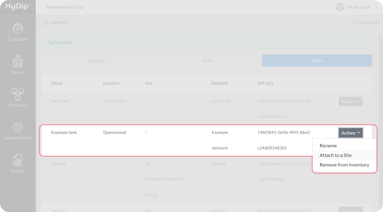 Press Save which will create the Tank and load to Inventory page when successful. From there find the Tank that was just created and click on the Actions drop down menu beside it. Select Attach to a Site from the menu.
